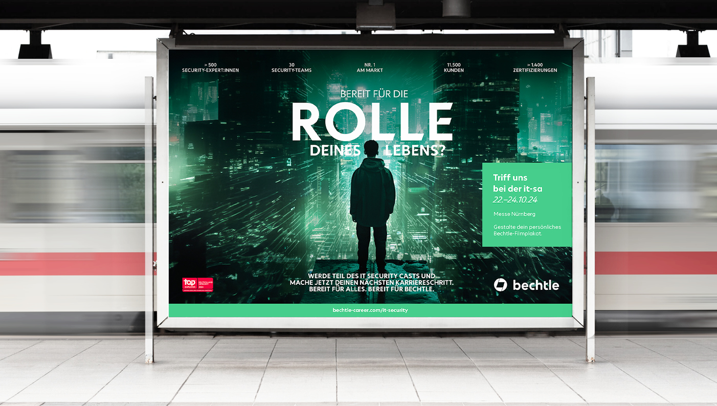 Mit einer durchdachten Employer-Branding-Strategie haben wir Bechtle auf Messen, in sozialen Medien und in der digitalen Kommunikation erlebbar gemacht. Auf der it-sa 2024 inszenierten wir das Thema IT-Security als großes Kino – mit den Besucher:innen selbst in der Hauptrolle. Für das Hochschulmarketing entwickelten wir ein klares, wiedererkennbares Design für verschiedene Recruiting-Messen, ergänzt durch animierte Social-Media-Ads für digitale Plattformen.