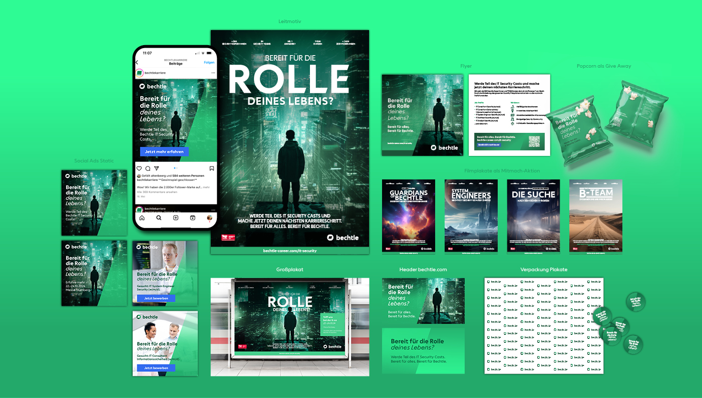 Kreative Give-aways wie gebrandete Popcorntüten runden das Konzept ab und machen das Motto „Ganz großes Kino“ erlebbar. Die Employer-Branding-Kampagne erzielt hohe Sichtbarkeit und schärfte nachhaltig das Markenbild von Bechtle, sowohl als Arbeitgeber als auch als verlässlicher Partner im Bereich IT-Security.